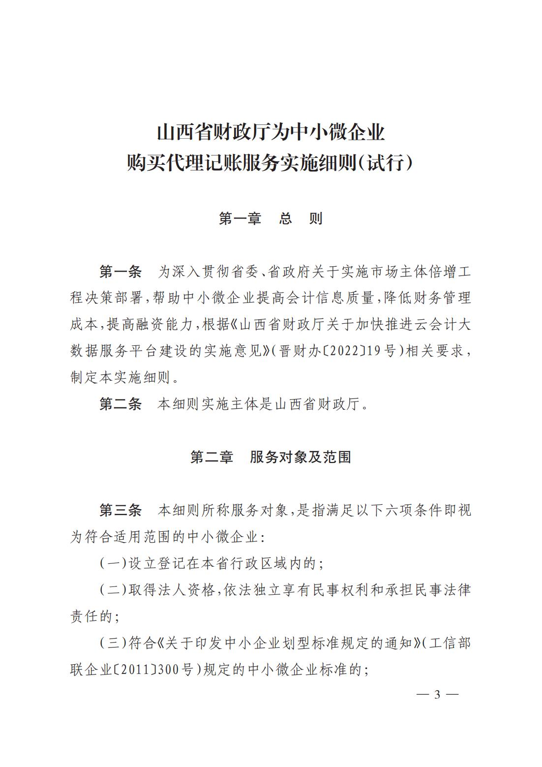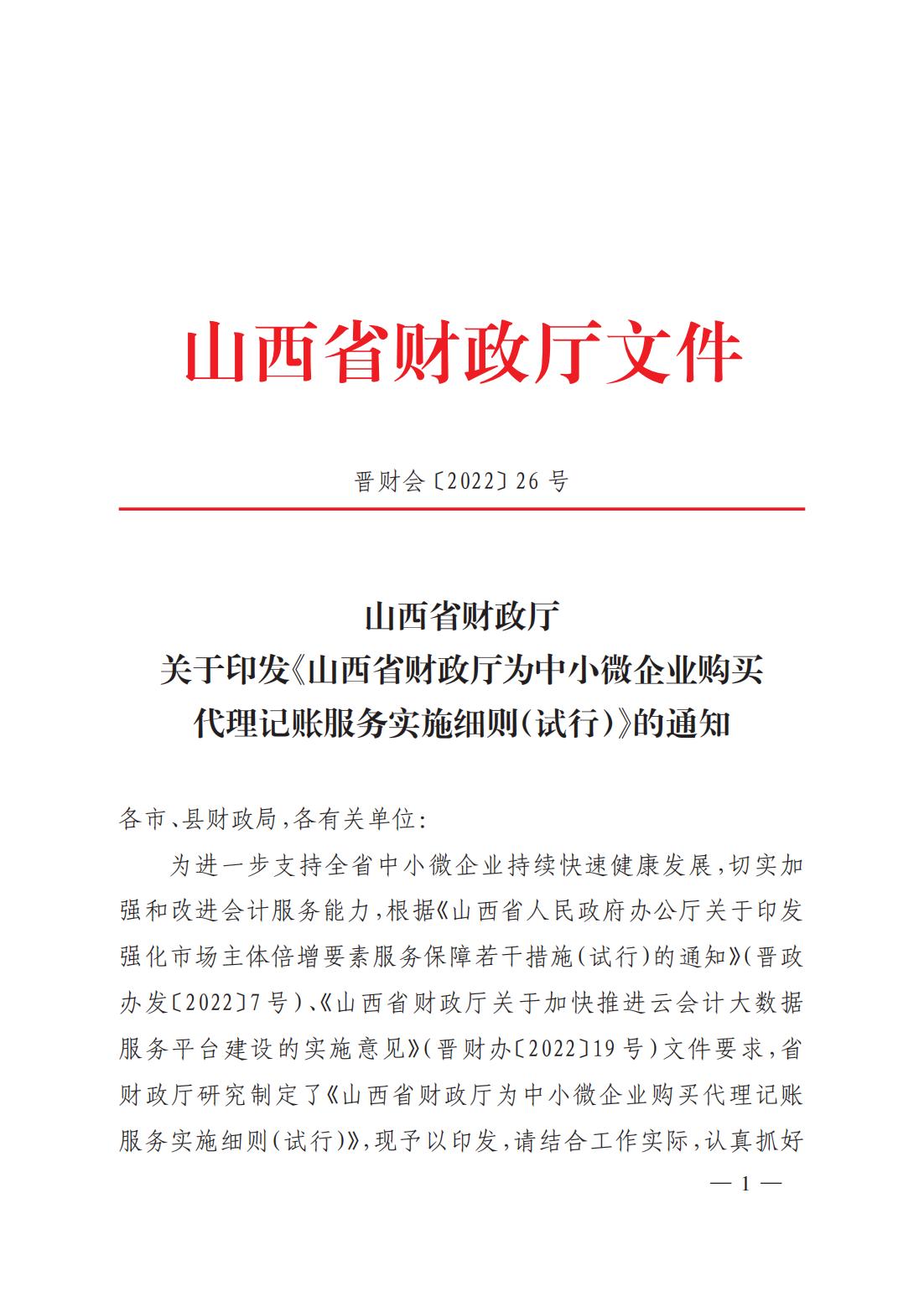 關(guān)于印發(fā)《山西省財(cái)政廳為中小微企業(yè)購買代理記賬服務(wù)實(shí)施細(xì)則(試行)》的通知
